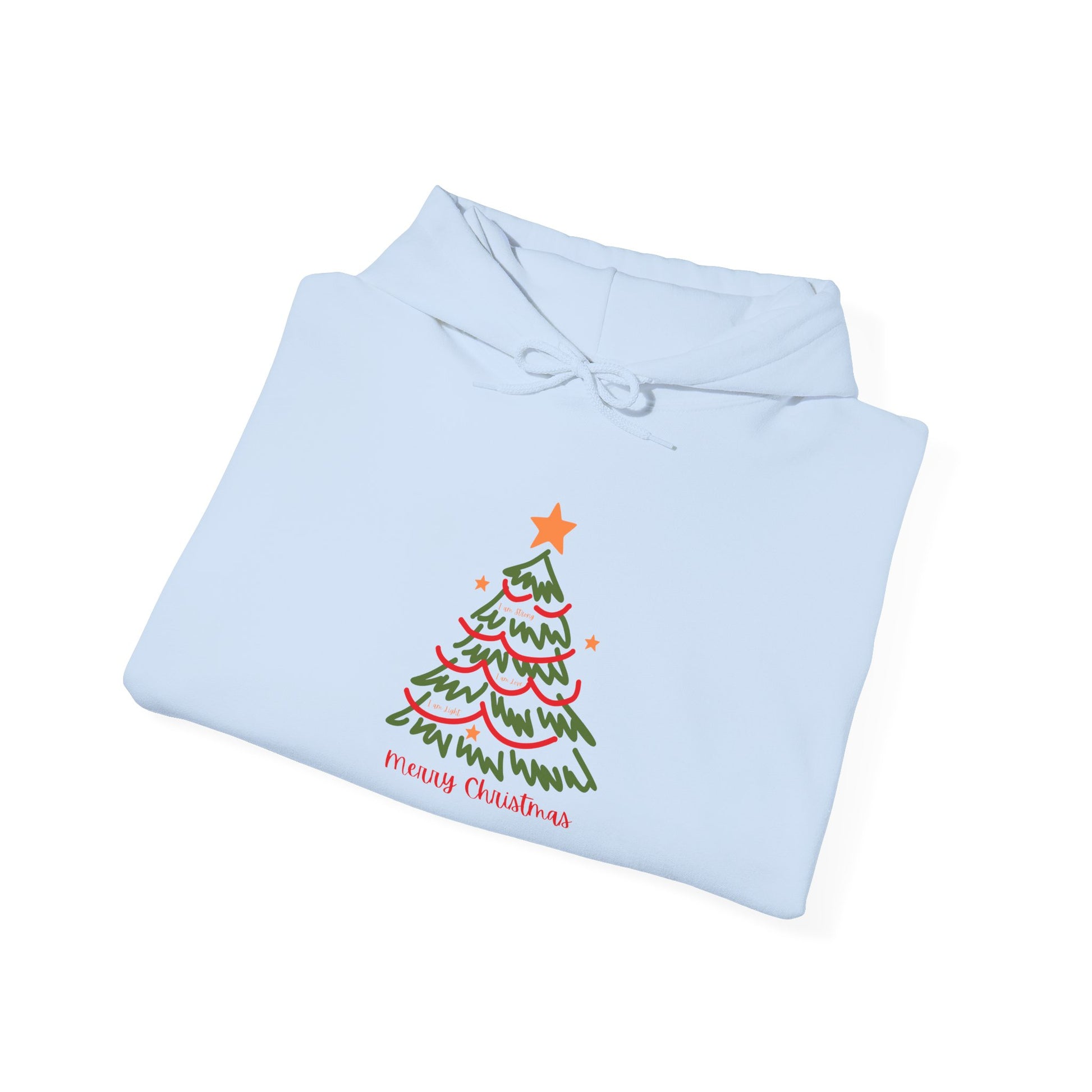 A cozy, midweight hoodie with a hand-drawn holiday tree on the chest—soft, warm, and quietly festive. The small illustrated tree uses simple green boughs, red accents, and a star on top, sitting above a subtle “Merry Christmas” script. Wear it for slow mornings with coffee, carol practices, or late-night wrapping sessions. The roomy kangaroo pocket keeps cold hands tucked in. Clean lines and a classic fit make this hoodie a comfortable layer that still feels thoughtful and personal during seasonal gatherings.